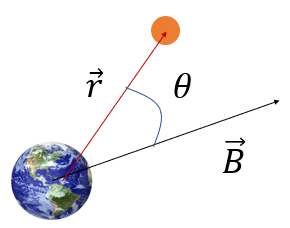 여기서 \(B\)는 벡터 \(\vec{B}\)의 크기이며 \(\theta\)는 \(\vec{r}\)과 \(\vec{B}\)의 사잇각이다.