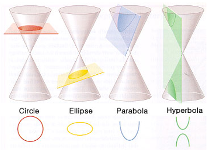 아래 그림과 같이 원추를 어떻게 자르느냐에 따라 원추의 단면은 원 (circle), 타원 (ellipse), 포물선 (parabola), 쌍곡선 (hyperbola) 모양이 되는데, 궤적 방정식도 \(e\)값에 따라서 각각 원, 타원, 포물선, 쌍곡선의 식이 된다.
