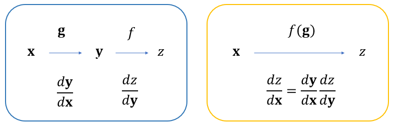 \[ \frac{df}{d \mathbf{x}} = \frac{d \mathbf{y}}{d \mathbf{x}} \frac{df}{d \mathbf{y}} \tag{7} \]