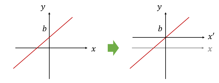 이므로 선형 시스템이 아니다. 보기에는 선형 시스템 같은데 정의대로 하니까 아니다. y-절편이 있는 게 문제다. 이런 경우에는 그림과 같이 좌표축을 살짝 평행 이동해 주면 선형이 되므로 비선형 시스템이라고 하지 않고, 어파인(affine) 시스템이라고 한다. 어파인 시스템도 선형 시스템으로 간주한다.