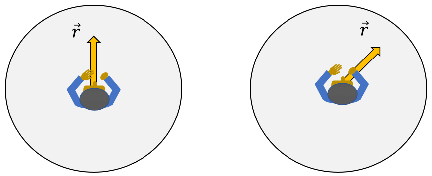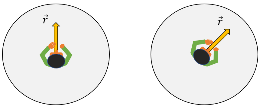 반면에 원판의 중심에 또다른 관찰자 B가 있다고 하자. 관찰자 B는 원판이 회전함에도 불구하고 원판과는 별개로 그대로 있다고 하자(약간 공중 부양해 있다고 가정). 그러면 관찰자 B에게는 시간이 흐름에 따라 벡터 \(\vec{r}\)의 크기는 변하지 않겠지만 방향은 계속 달라질 것이므로, 이 벡터를 시간에 대해서 미분한다면 관찰자 B는 그 값이 \(0\) 이 아니라고 할 것이다.