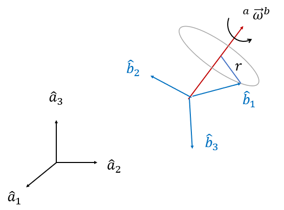 어떤 좌표계가 다른 좌표계에 대해서 상대적인 회전 운동을 한다면 그 운동을 각속도 벡터 \( ^a \vec{\omega}^b\)로 표현할 수 있다.