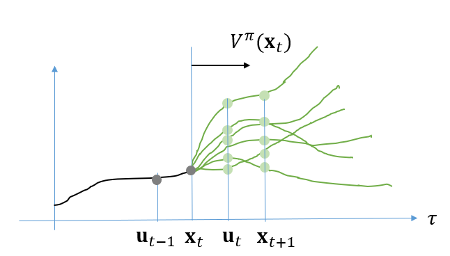 \[ V^\pi (\mathbf{x}_{t+1} ) = \mathbb{E}_{\tau_{u_{t+1}:} \sim p(\tau_{u_{t+1}: } | \mathbf{x}_{t+1} ) } \left[ r_{t+1}+ \gamma r_{t+2} + \gamma^2 r_{t+3} + \cdots | \mathbf{x}_{t+1} \right] \]