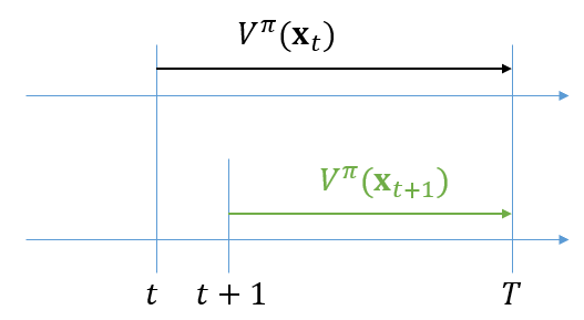 \[ \begin{align} V^\pi (\mathbf{x}_{t+1} ) &= \mathbb{E}_{\tau_{u_s:} \sim p(\tau_{u_s: } | \mathbf{x}_s ) } \left[ r_s+ \gamma r_{s+1} + \gamma^2 r_{s+2} + \cdots | \mathbf{x}_s \right] \\ \\ &= V^\pi (\mathbf{x}_s) \end{align} \]