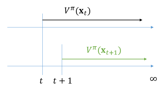 무한구간에서 \(V^\pi (\mathbf{x}_t )\)는 정의에 의해서 다음과 같이 된다.
