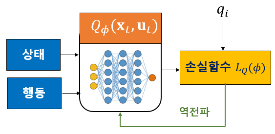 이제 소프트 행동가치 함수와 정책을 추정하기 위해서 신경망을 이용하기로 하자. 행동가치 함수를 추정하기 위한 신경망을 Q 신경망 또는 크리틱(critic) 신경망이라 하고 파라미터를 \(\phi\) 로, 정책을 추정하기 위한 신경망을 액터 신경망이라 하고 파라미터를 \(\theta\) 로 표기한다. 그리고 추정된 행동가치를 \(Q_\phi (\mathbf{x}_t, \mathbf{u}_t)\) 로, 정책을 \(\pi_\theta (\mathbf{u}_t | \mathbf{x}_t)\) 로 표기하자.