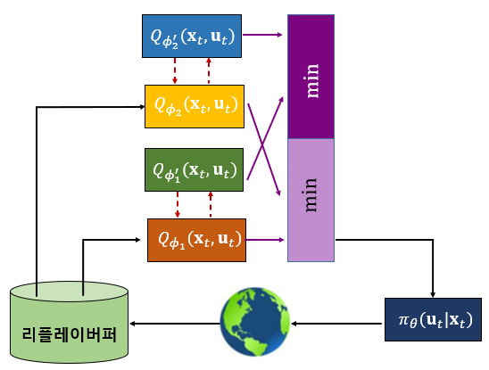 SAC를 처음 제안한 논문에서는 Q 함수의 과대추정 오차를 감소시키기 위해서 두 개의 독립적인 Q 신경망을 사용했다. 각각의 Q 신경망은 별도로 타깃 Q 신경망을 가지고 있으므로 총 5개의 신경망을 사용한 것이다. 복잡한 문제에서는 한 개의 Q 신경망을 사용할 때 보다 두 개의 Q 신경망을 사용할 때가 학습 속도가 훨씬 빨랐다고 한다.