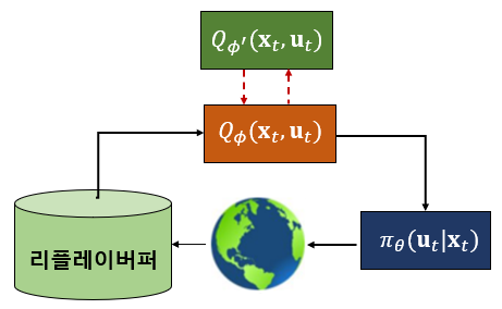 \(L_\pi (\theta)= \sum_i \left( \alpha \log \pi_\theta (\bar{\mathbf{u}}_i | \mathbf{x}_i ) - Q_\phi (\mathbf{x}_i, \bar{\mathbf{u}}_i ) \right) \) 로 액터 신경망을 업데이트 한다.