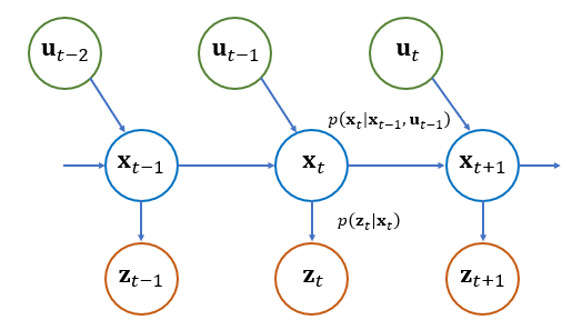 \[ \begin{align} & p(\mathbf{x}_t | \mathbf{x}_{0:t-1}, \mathbf{z}_{0:t}, \mathbf{u}_{0:t}) = p(\mathbf{x}_t | \mathbf{x}_{t-1}, \mathbf{u}_{t-1}) \tag{4} \\ \\ & p(\mathbf{z}_t | \mathbf{x}_{0:t}, \mathbf{z}_{0:t}, \mathbf{u}_{0:t}) = p(\mathbf{z}_t | \mathbf{x}_t) \tag{5} \end{align} \]