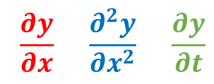 예를 들어서 \(y(x,t)=x^3+2t\) 를 \(x\) 에 대해서 편미분하면, \(\frac{\partial y}{\partial x}=3x^2\) 이다. 한번 더 편미분하면 \( \frac{\partial^2 y}{\partial x^2} =6x\) 이다. \(x=1\) 에서 1차 편미분값과 2차 편미분값을 구하면 각각 \(3\) 과 \(6\) 이다. 한편, \(t\) 에 대해서 편미분하면, \( \frac{\partial y}{\partial t}=2\) 이다.