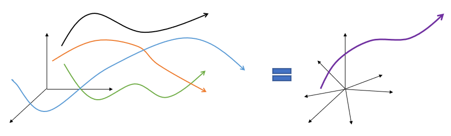 \(N\) 개의 질점으로 이루어진 시스템이 있다고 하자. 각 질점의 위치는 \(N\) 개의 위치 벡터 \(\mathbf{r}_k=\mathbf{r}_k (x_k, y_k, z_k ), \ \ k=1,...,N\) 으로 표현할 수 있다. 여기서 \(x_k, y_k, z_k\) 는 \(k\) 번째 질점의 위치를 직교 좌표계(Cartesian coordinate)로 표시한 좌표다. 질점이 운동할 경우 질점의 각 위치를 시간의 함수 \(x_k (t), y_k (t), z_k (t)\) 로 표현하면 된다. 그러면 3차원 공간상에 \(N\) 개의 운동 궤적이 나타날 것이다.