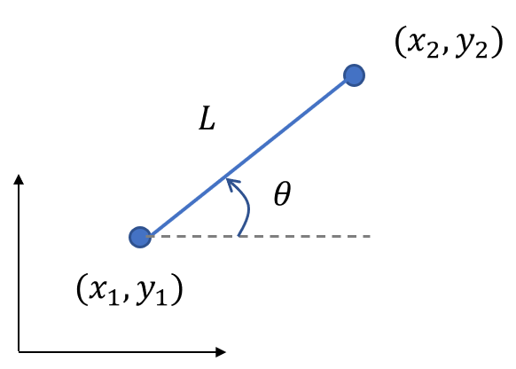 두 질점이 평면상을 자유롭게 운동할 때에는 \(x_1, y_1, x_2, y_2\) 등 4개의 좌표가 필요하지만 구속조건 때문에 3개의 좌표만 있으면 두 질점의 운동을 기술할 수 있다. 왜냐하면 구속조건 식으로 한 개의 좌표를 다른 3개 좌표의 함수로 표현할 수 있기 때문이다. 이 때 만약 그림에 있는 것처럼 일반화 좌표를 \(x_1, y_1, \theta\) 로 선정한다면 두 질점의 운동을 좀 더 편리하게 기술할 수 있을 것이다.