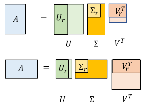 이다. \( V_r \)은 \( n \times r \) 행렬이고 \( U_r \)은 \( m \times r \) 행렬이며 \( \Sigma _r \)은 대각 성분이 행렬 \( A \)의 특이값인 \( r \times r \) 대각 행렬이다. 특이값은 큰 수에서 작은 수의 순서로 정렬되어 있다.