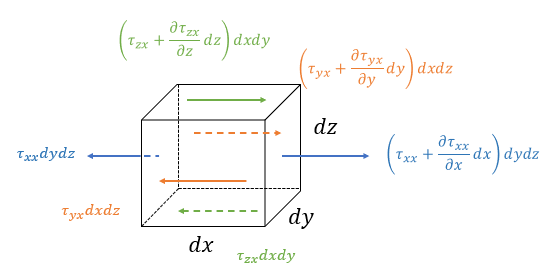 \[ \begin{align} d\mathbf{F}_v &= dxdydz \ \left( \frac{\partial \tau_{xx}}{\partial x} +\frac{\partial \tau_{yx}}{\partial y}+ \frac{\partial \tau_{zx}}{\partial z} \right) \ \mathbf{i} \tag{3} \\ \\ & \ \ \ + dxdydz \ \left( \frac{\partial \tau_{xy}}{\partial x} +\frac{\partial \tau_{yy}}{\partial y}+ \frac{\partial \tau_{zy}}{\partial z} \right) \ \mathbf{j} \\ \\ & \ \ \ + dxdydz \ \left( \frac{\partial \tau_{xz}}{\partial x} +\frac{\partial \tau_{yz}}{\partial y}+ \frac{\partial \tau_{zz}}{\partial z} \right) \ \mathbf{k} \end{align} \]