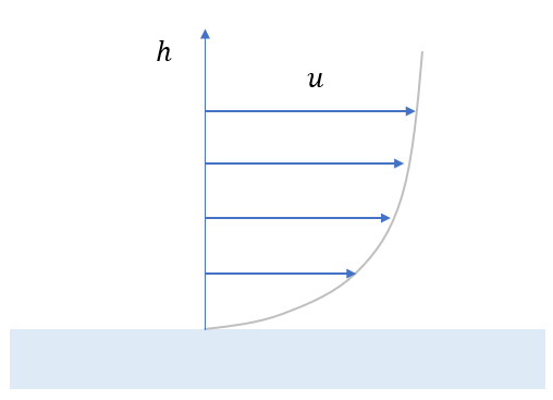 유체의 점성은 유체의 변형에 대항하는 저항력과 같은 역할을 하는데 전단응력이 유체의 점성과 관련이 있다. 아래 그림과 같이 물체의 표면 주위를 흐르는 유체는 점성 때문에 표면에서는 속도가 \(0\) 이고 표면으로부터의 거리에 따라 유속이 달라진다.