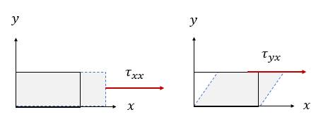 점성력도 유체요소의 표면에 작용하는 표면력으로서 표면에 수직으로 작용하는 수직응력(normal stress)과 평행하게 작용하는 전단응력(shear stress)로 나눠진다.