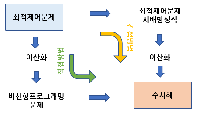 이에 비해 직접방법에서는 최적 필요조건 대한 해석식이 필요 없고, 코스테이트(costate)의 초기 추측값도 필요 없다. 직접방법의 본질은 연속시간 최적제어 문제에서 상태변수와 제어입력을 이산화(discretization)시켜 비선형 프로그래밍 문제(nonlinear programming problem)로 바꾸는 것이다. 비선형 프로그래밍 문제 풀이를 위한 효율적인 알고리즘이 많이 있기 때문이다.