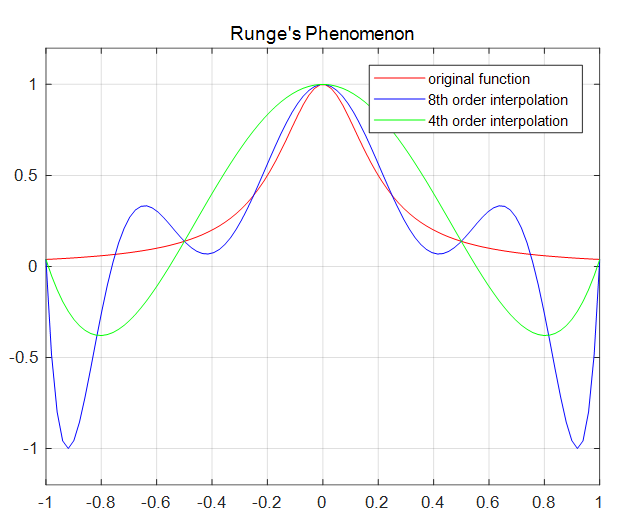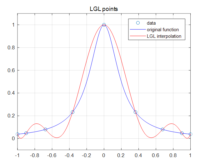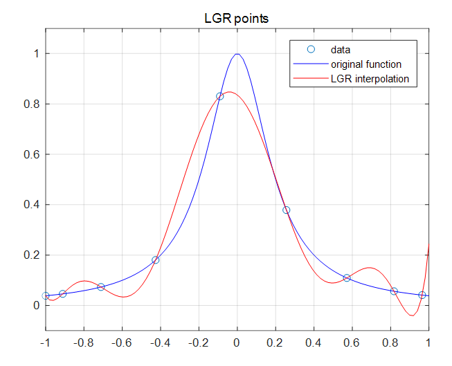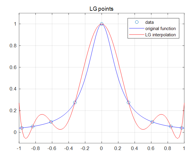 다음 그림은 각각 LGL, LG, LGR 포인트를 보간점으로 하는 8차 라그랑지 보간 다항식과 실제 함수의 그림을 비교한 것이다. 룽게현상이 확실히 준 것을 알 수 있다. LGR 포인트는 LGL, LG 포인트와는 달리 보간점의 분포가 비대칭이므로 보간 다항식의 결과가 실제 함수와 달리 비대칭적이다.