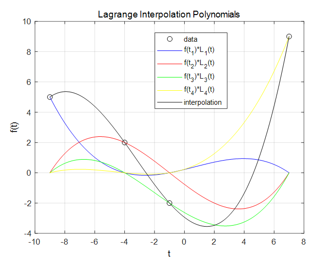 라그랑지 기저 다항식의 갯수는 보간점의 갯수와 같다. 아래 그림은 4개의 보간점에서 데이터셋 \((-9, 5)\), \( (-4, 2)\), \( (-1, -2)\), \( (7, 9)\) 가 주어졌을 때, 기저 다항식 \(L_1 (t), ..., L_4 (t)\) 와 보간 다항식 \(p(t)\) 를 그린 것이다.