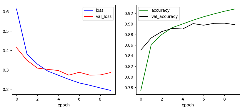 모델을 컴파일하고, MNIST보다 어려운 문제이므로 에폭 10으로 학습한다.