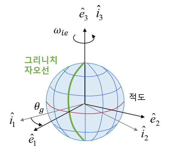 여기서 \(\theta_g\) 는 ECI 좌표계에서 ECEF 좌표계로의 회전각으로 그리니치 평균항성시(GMST, Greenwich Mean Sidereal Time) 또는 그리니치 각이라고 한다.