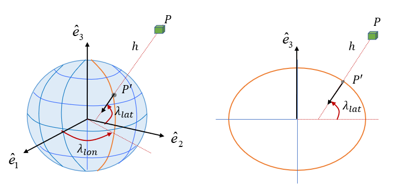 경도 (\(\lambda_{lon}\))는 본초 자오선 평면과 점 \(P^\prime\) 을 통과하는 자오선 평면과의 각도로 정의하며, 위도 (\(\lambda_{lat}\))는 점 \(P^\prime\) 에서 중력가속도 방향과 적도면과의 각도로 정의한다. 높이 (\(h\))는 점 \(P^\prime\) 과 \(P\) 의 거리로 정의하는데, 기하학적으로 정의된 지구 타원과 실제 지표와는 다르기 때문에 일반적인 지표상의 높이와는 다르다.