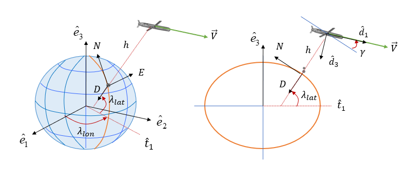 \[ \begin{align} & \dot{\lambda}_{lat}= \frac{ V \cos \psi \cos \gamma}{ R_{mr}+h} \tag{12} \\ \\ & \dot{\lambda}_{lon}= \frac{ V \sin \psi \cos \gamma }{ (R_{tr}+h) \cos \lambda_{lat}} \\ \\ & \dot{h}=V \sin \gamma \end{align} \]
