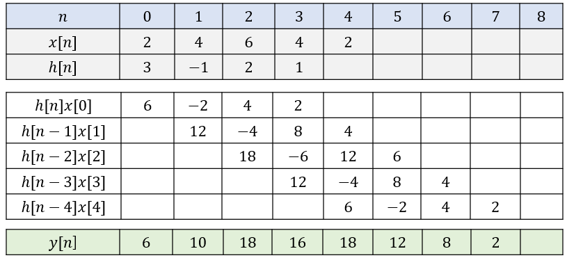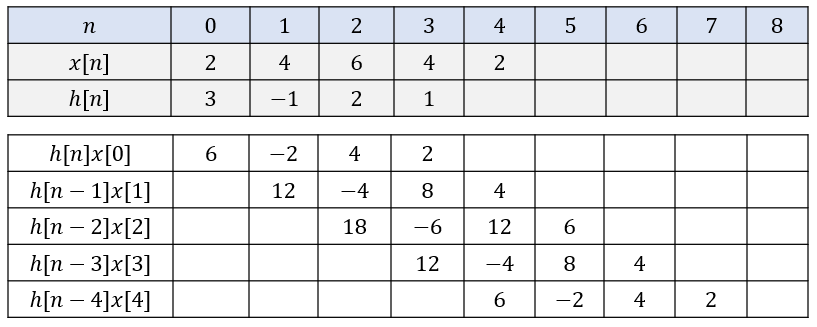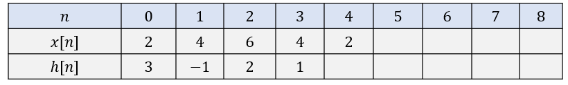 공식대로 계산하려면 다음과 같은 절차를 밟아야 한다. 우선 \( x[n] \)과 \( h[n] \)이 유한 구간에서만 값을 갖고 나머지 구간에서는 모두 0이므로 다음과 같이 두 값을 테이블에 쓴다.