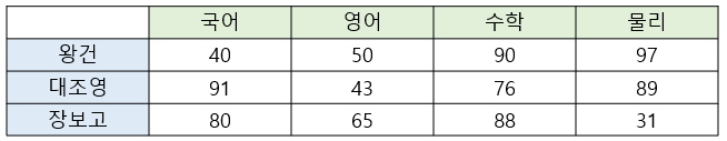 테이블 형태로 주어지는 많은 일상적인 또는 전문적인 데이터도 행렬로 표현할 수 있다. 예를 들면 학생의 각 과목 성적을 행렬로 표현할 수 있다.