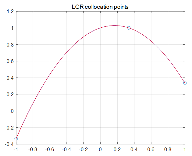 다음은 2개의 LGR (Legendre-Gauss-Radau) 콜로케이션 포인트 \(t_1=-1, t_2=0.3333\) 의 경우이다. 보간점으로는 여기에 포인트 \(t_3=1\) 을 추가한다. 그럼 각 콜로케이션 포인트에서는 다음 미분 방정식을 만족해야 한다.