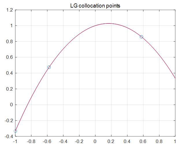 이번에는 2개의 LG(Legendre-Gauss) 콜로케이션 포인트 \(t_1=-0.5774, t_2=0.5774\) 를 이용해 보자. 보간점으로는 여기에 포인트 \(t_0=-1\) 을 추가한다. 그러면 각 콜로케이션 포인트에서는 다음 미분 방정식을 만족해야 한다.
