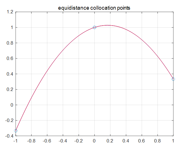 먼저 3개의 등간격(equidistance) 콜로케이션 포인트 \(t_1=-1, t_2=0, t_3=1\) 을 이용해 보자. 보간점은 콜로케이션 포인트와 일치시킨다. 그럼 각 콜로케이션 포인트에서는 식 (3)으로 주어진 대로 다음 미분 방정식을 만족해야 한다.