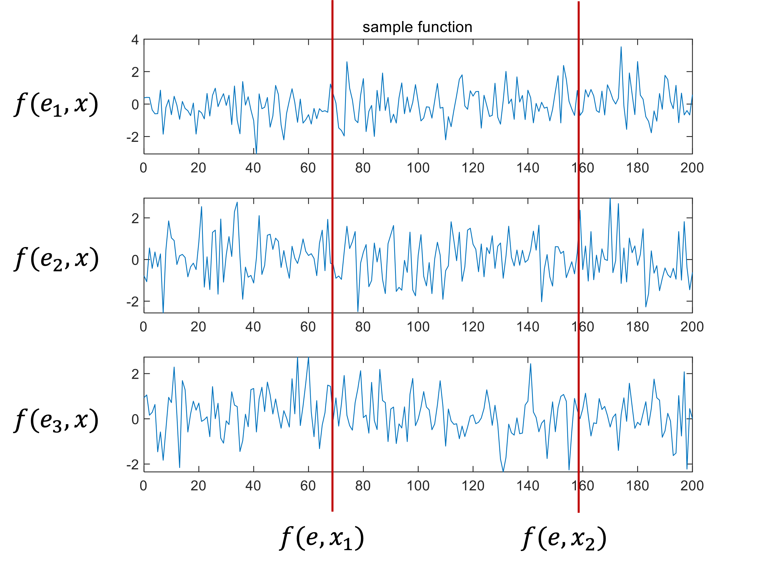 인덱스 파라미터를 고정시킨다면 랜덤 프로세스는 랜덤변수가 된다. 또한 확률 실험 결과를 고정시킨다면 랜덤 프로세스는 확정적 함수가 된다. 이 함수를 샘플함수(sample function)라고 한다.