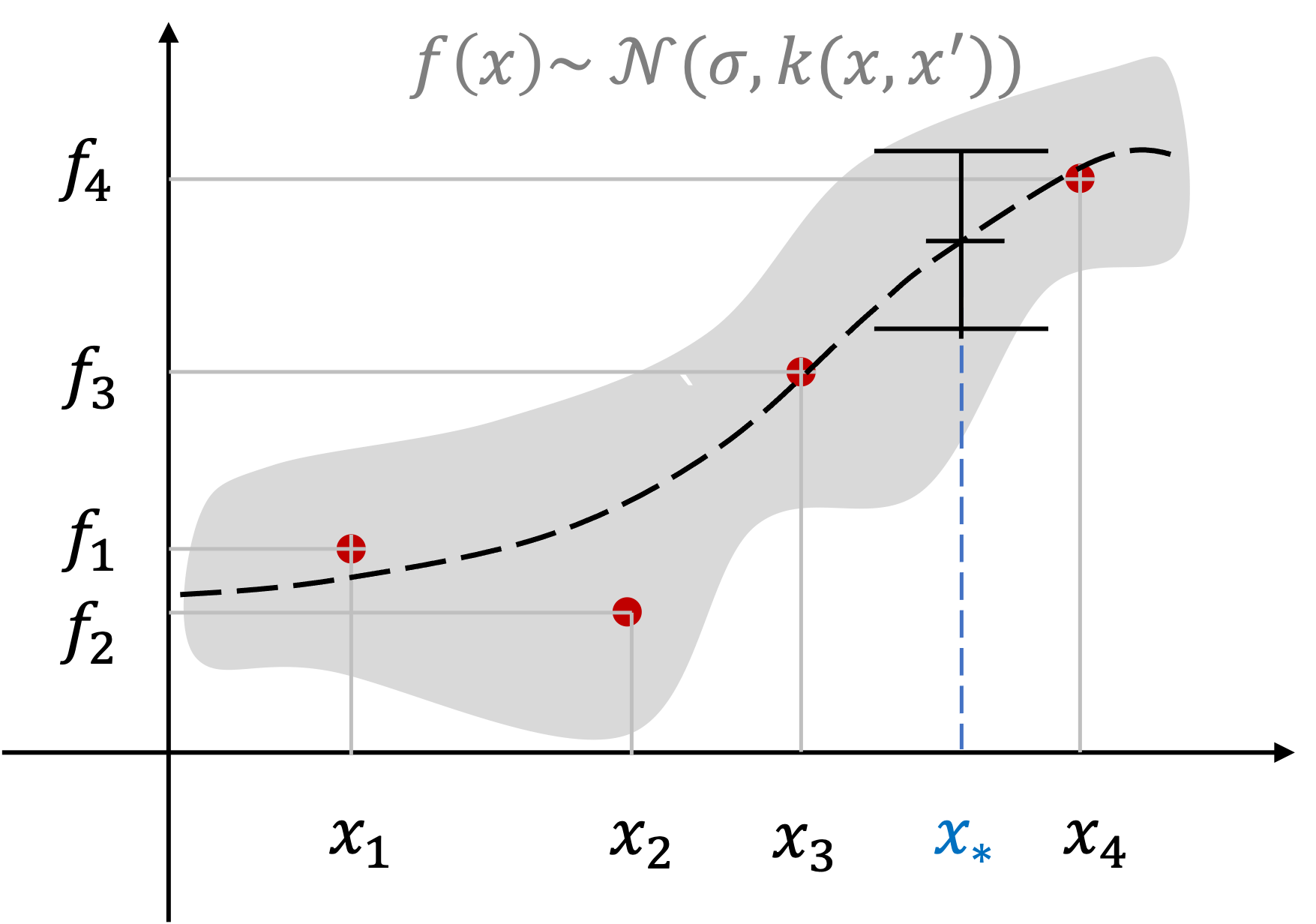 반면에 GP 회귀 문제에서는 이와 다른 접근 방법을 사용한다. 목표 함수가 특정 형태를 갖는다고 가정하는 대신에 가우시안 프로세스 \(f(\mathbf{x})\) 로 간주한다. 구현 가능한 모든 함수에 대해 확률을 부여하는 접근 방법이라고 볼 수 있겠다. 미지의 함수를 가우시안 프로세스 \(f(\mathbf{x})\) 로 표현한다는 것은 데이터셋에서 \(m\) 개의 관측값 \(\mathbf{f}_{1:m} = \begin{bmatrix} f_1 & f_2 & ... & f_m \end{bmatrix}^T\) 을 어떤 가우시안 프로세스의 특정 인덱스 \(\mathbf{x}_{1:m}\) 에서 샘플링된 값으로 간주하는 것이다. 즉,