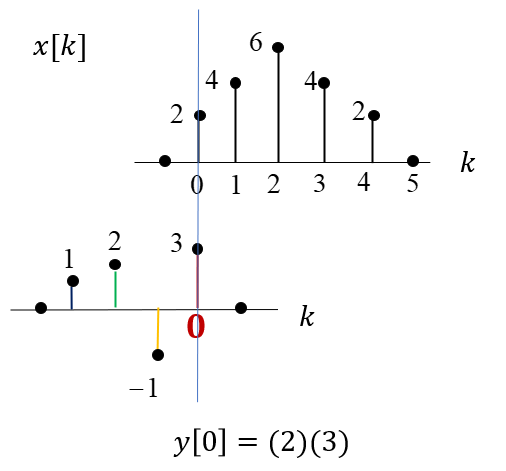 \( n=0 \)에서 \( k \)에 대해서 \( x[k] \)와 \( h[n-k] \)를 곱하고 더한다.