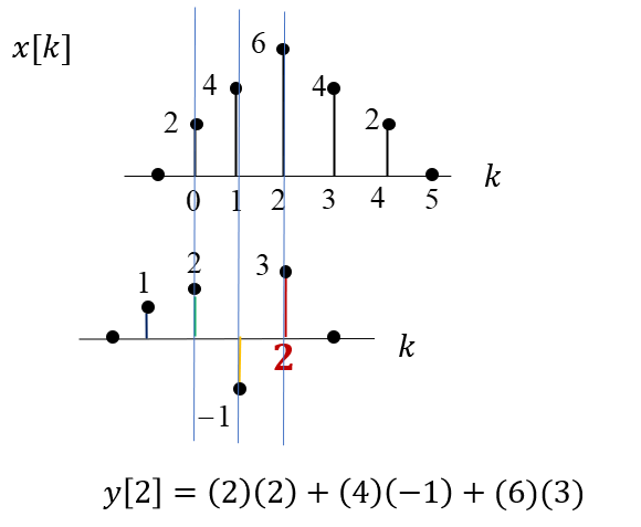\( n=2 \)에서 \( k \)에 대해서 \( x[k] \)와 \( h[n-k] \)를 곱하고 더한다.