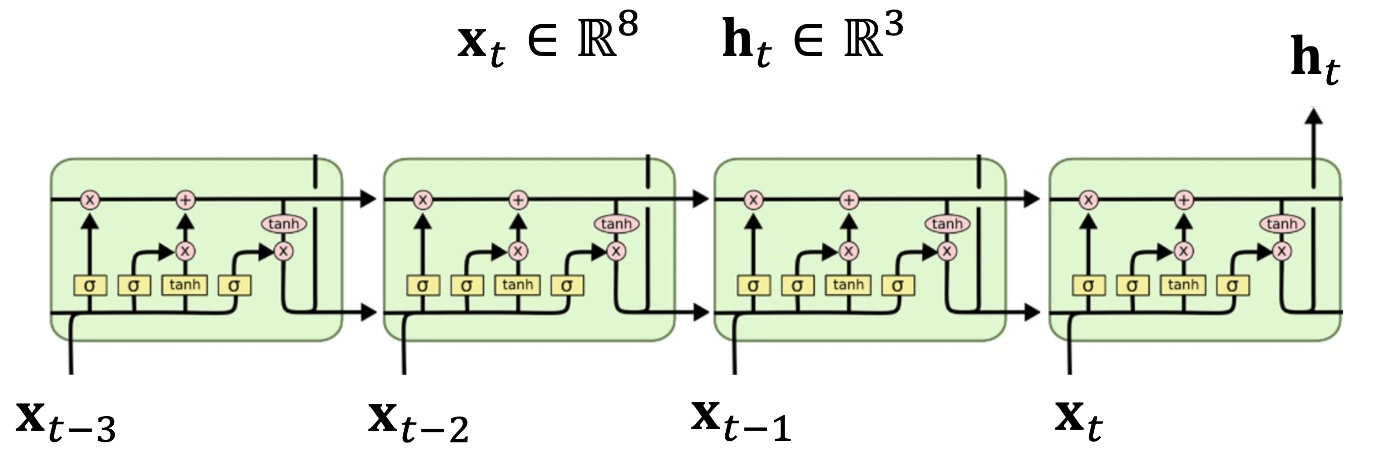 Tensorflow에서는 tf.keras.layers.LSTM 클래스를 통해서 LSTM을 표현하는데 먼저 단순한 단방향 모델부터 구현하면서 이 클래스의 구조를 살펴보도록 하자. 다음 그림은 시퀀스 길이가 4 (\(t-3, t-2, t-1, t\)), 은닉 상태변수의 차원이 \(\mathbf{h}_t \in \mathbb{R}^3\), 입력 변수의 차원이 \(\mathbf{x}_t \in \mathbb{R}^8\) 인 LSTM 모델을 나타낸 것이다.