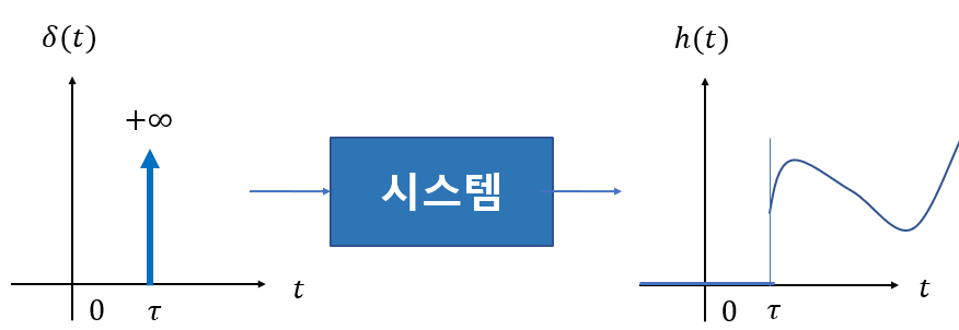 이제 임펄스를 LTI 시스템의 입력으로 가해보자. 이 때의 출력을 임펄스 반응이라고 하며 기호로 \(h(t)\) 로 쓴다.