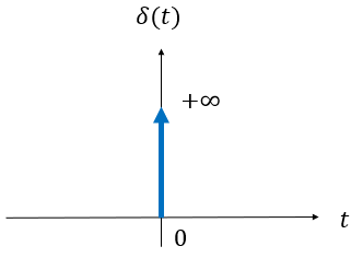 디랙 델타 함수는 \(t=0\) 에서만 무한대의 크기를 갖고 그 외에는 모두 \(0\) 의 값을 갖는다. 하지만 함수의 면적은 \(1\) 로 고정되어 있다. 그림으로 표현하면 다음과 같다.
