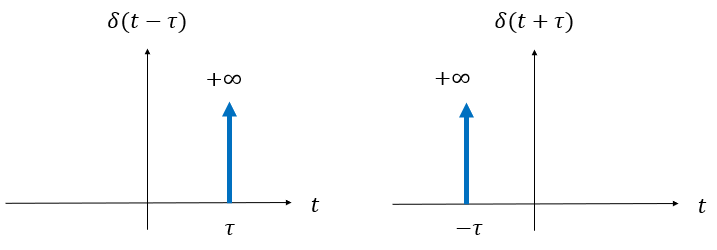 임펄스 함수를 오른쪽으로 \(\tau\) 만큼 시프트(shift)시키면 \(\delta(t-\tau)\) 이다. 임펄스 함수를 왼쪽으로 \(\tau\) 만큼 시프트 시키면 \(\delta (t+\tau)\) 이다. 아래 다음의 왼쪽은 \(\delta (t-\tau)\) 를 오른쪽은 \(\delta (t+\tau)\) 를 그린 것이다.