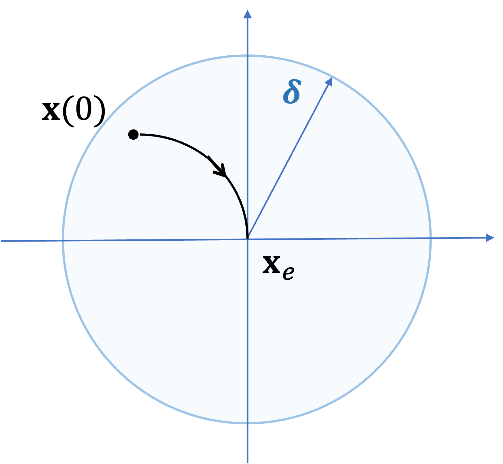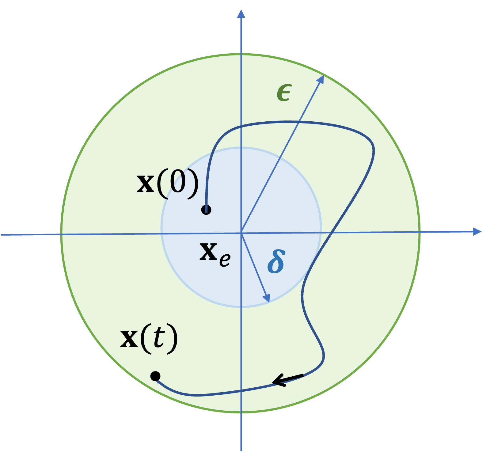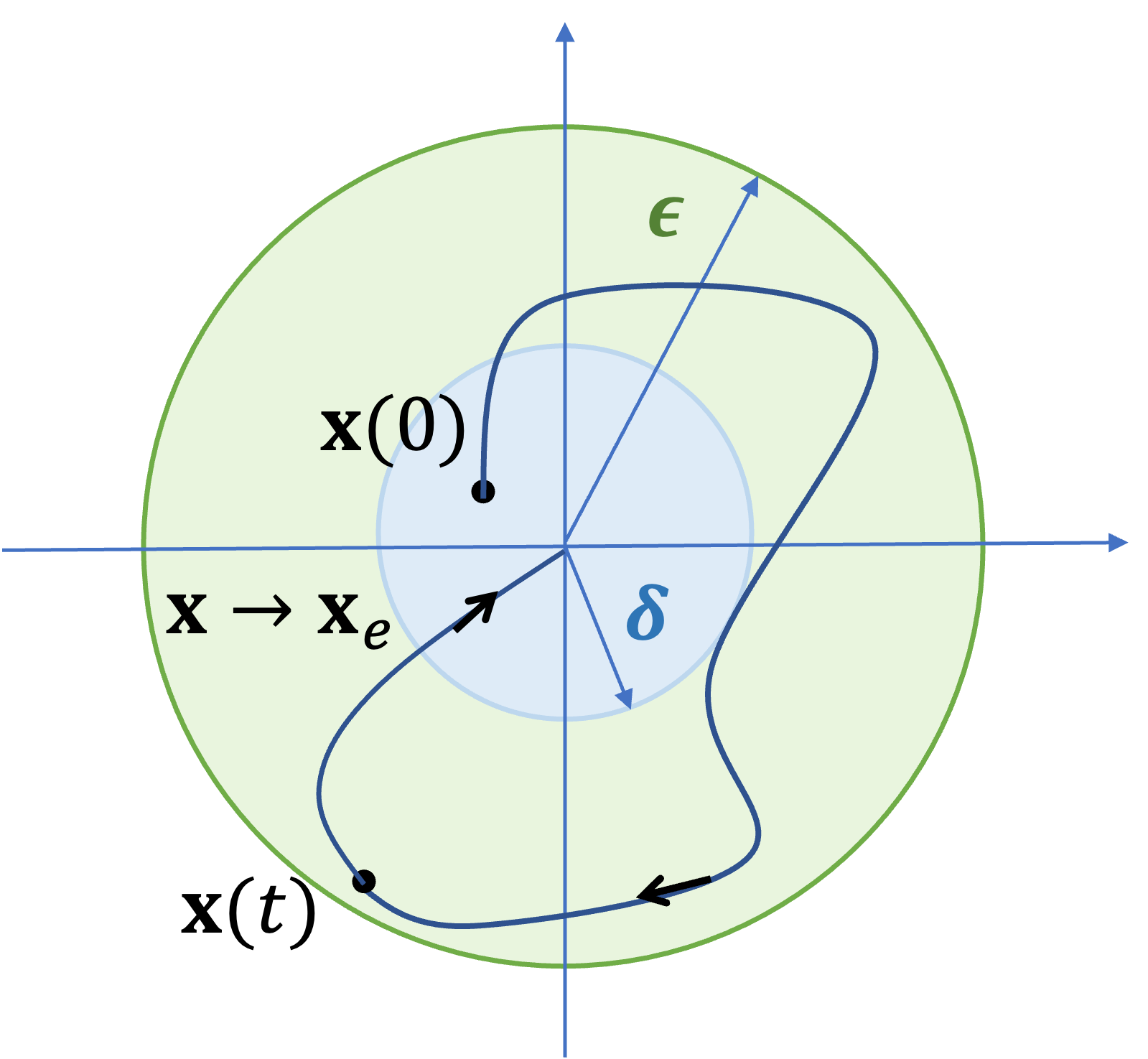여기서 \(\mathbf{x}(0)\) 는 시간이 \(t=0\) 일 때의 상태변수값인 초기값을 말한다. \(\Vert \mathbf{x}(0)- \mathbf{x}_e \rVert \lt \delta \) 는 중심이 \(\mathbf{x}_e\) 이고 반지름이 \(\delta\) 인 원구(ball)의 내부에 \(\mathbf{x}(0)\) 가 위치해 있다는 의미이다. \(\Vert \mathbf{x}(t)- \mathbf{x}_e \rVert \lt \epsilon \) 는 중심이 \(\mathbf{x}_e\) 이고 반지름이 \(\epsilon\) 인 원구(ball)의 내부에 상태변수의 시간 궤적 \(\mathbf{x}(t)\) 가 머물고 있다는 의미이다.