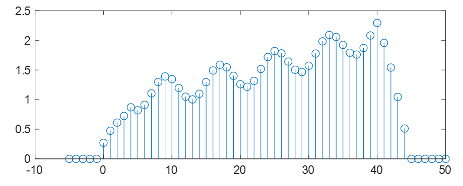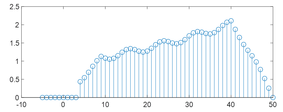 출력 \( y[n] \)은 시스템의 임펄스 반응 \( h[n] \)과 입력 \( x[n] \)의 컨볼루션을 계산하면, 10 포인트 이동평균 필터는 어떤 입력 \( x[n] \)에 대해서 다음 출력을 생성한다.