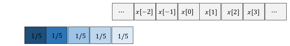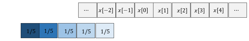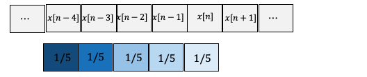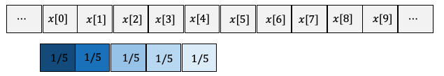 시간스텝 \( n \)에서의 출력은 시간스텝 \( n \)에서의 입력부터 4단계의 시간스텝 전까지의 입력을 모두 더한 후 5로 나눈 것이다.