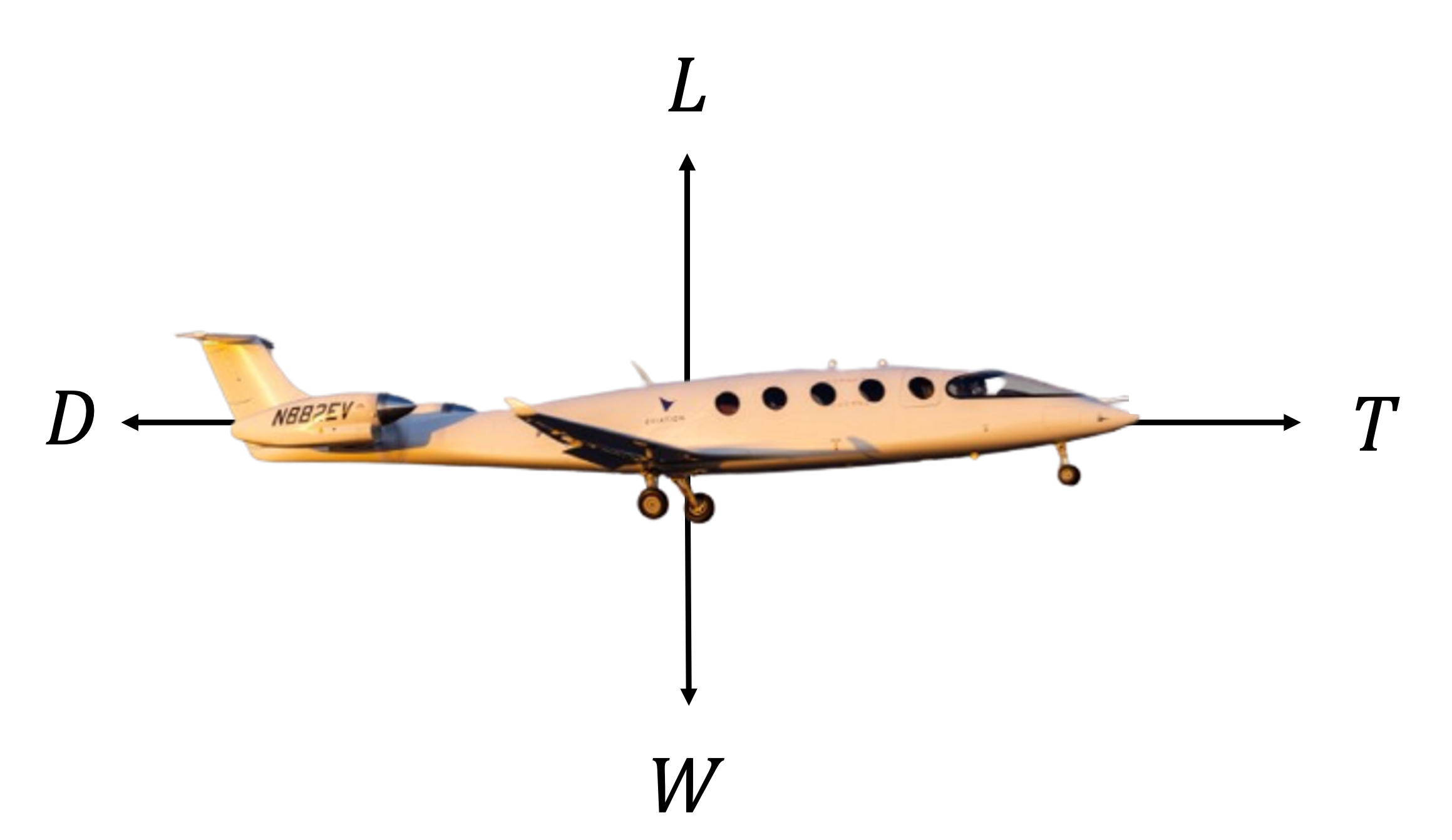 비행에 필요한 동력(power)을 전적으로 배터리가 제공한다면 \(P_e=P_{req}\) 가 되어야 한다. 여기서 \(P_{req}\) 는 요구 동력(required power)로서 추력(\(T\))와 항공기 비행 속도(\(v\))의 곱으로 주어진다.