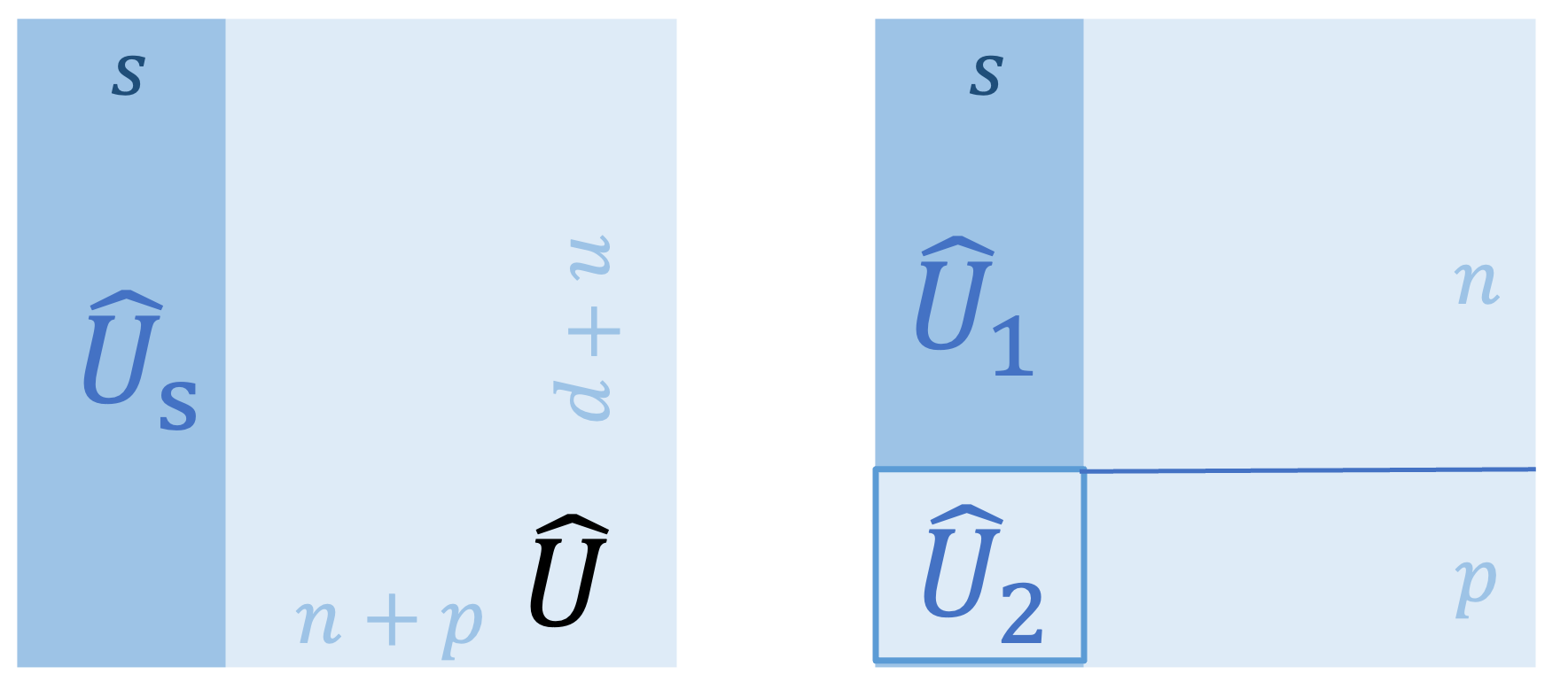 여기서 \(\hat{U}_s^T = \begin{bmatrix} \hat{U}_1^T & \hat{U}_2^T \end{bmatrix} \) 이고 \(\hat{U}_1 \in \mathbb{R}^{n \times s}\), \(\hat{U}_2 \in \mathbb{R}^{p \times s}\) 이다.