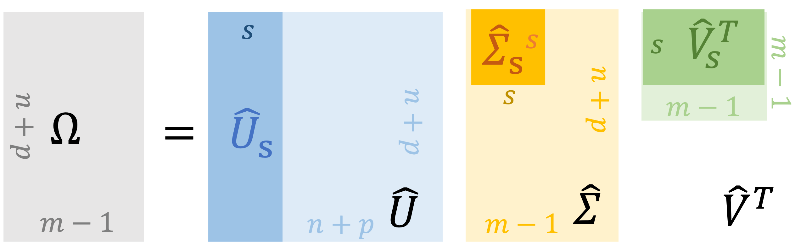 \[ \begin{align} \mathbf{\Omega} &= \hat{U} \hat{\Sigma} \hat{V}^T = \begin{bmatrix} \hat{U}_s & \hat{U}_{rem} \end{bmatrix} \begin{bmatrix} \hat{\Sigma}_s & 0 \\ 0 & \hat{\Sigma}_{rem} \end{bmatrix} \begin{bmatrix} \hat{V}_s^T \\ \hat{V}_{rem}^T \end{bmatrix} \\ \\ & \approx \hat{U}_s \hat{\Sigma}_s \hat{V}_s^T \\ \\ & = \begin{bmatrix} \hat{U}_1 \\ \hat{U}_2 \end{bmatrix} \hat{\Sigma}_s \hat{V}_s^T \end{align} \]