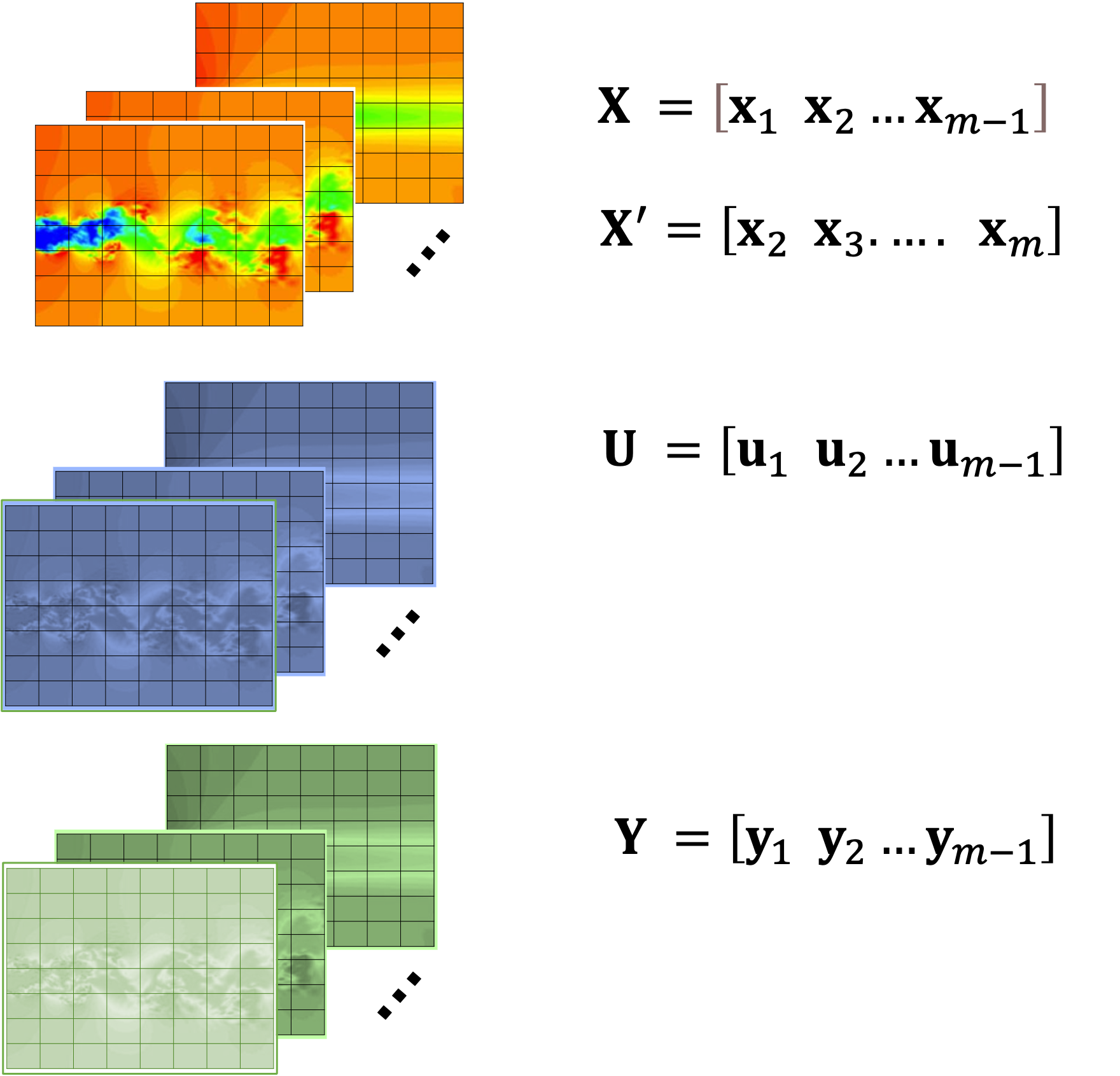 \[ \begin{align} & \mathbf{X} =[\mathbf{x}_1 \ \ \ \mathbf{x}_2 \ \ \ \cdots \ \ \ \mathbf{x}_{m-1} ] \ \ \ \in \mathbb{R}^{n \times (m-1)} \\ \\ & \mathbf{X}' =[\mathbf{x}_2 \ \ \ \mathbf{x}_3 \ \ \ \cdots \ \ \ \mathbf{x}_m \ ] \ \ \ \ \ \in \mathbb{R}^{n \times (m-1)} \\ \\ & \mathbf{U} =[\mathbf{u}_1 \ \ \ \mathbf{u}_2 \ \ \ \cdots \ \ \ \mathbf{u}_{m-1} ] \ \ \ \in \mathbb{R}^{p \times (m-1)} \\ \\ & \mathbf{Y} =[\mathbf{y}_1 \ \ \ \mathbf{y}_2 \ \ \ \cdots \ \ \ \mathbf{y}_{m-1} ] \ \ \ \in \mathbb{R}^{q \times (m-1)} \end{align} \]