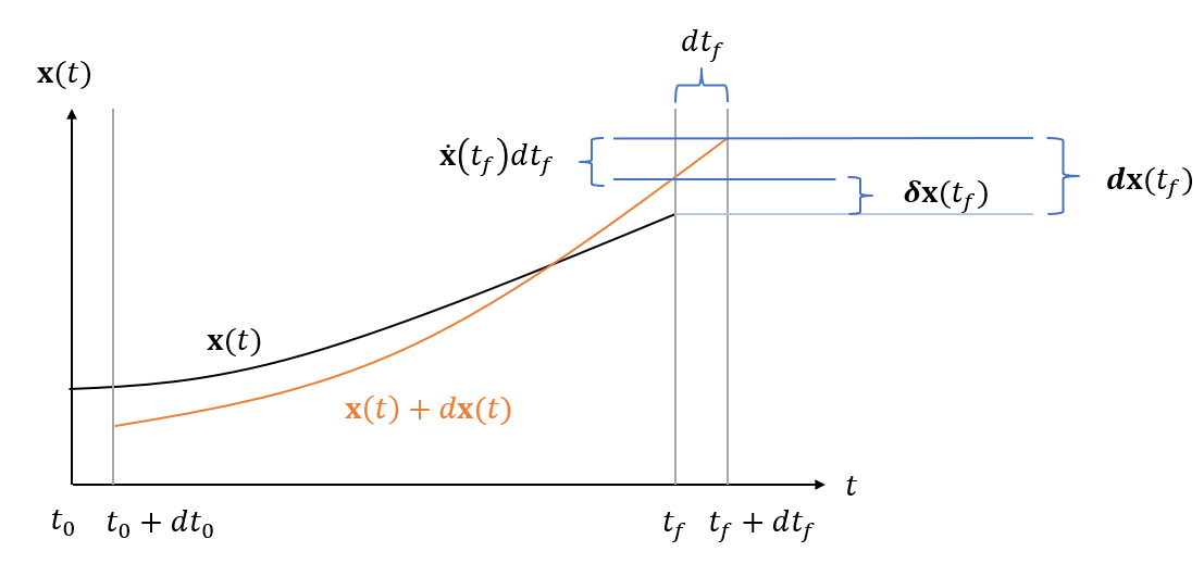 \[ \begin{align} & d \mathbf{x}(t_0 ) = \delta \mathbf{x}(t_0 )+ \dot{\mathbf{x}}(t_0 )dt_0 \tag{11} \\ \\ & d \mathbf{x}(t_f ) = \delta \mathbf{x}(t_f )+ \dot{\mathbf{x}}(t_f )dt_f \end{align} \]