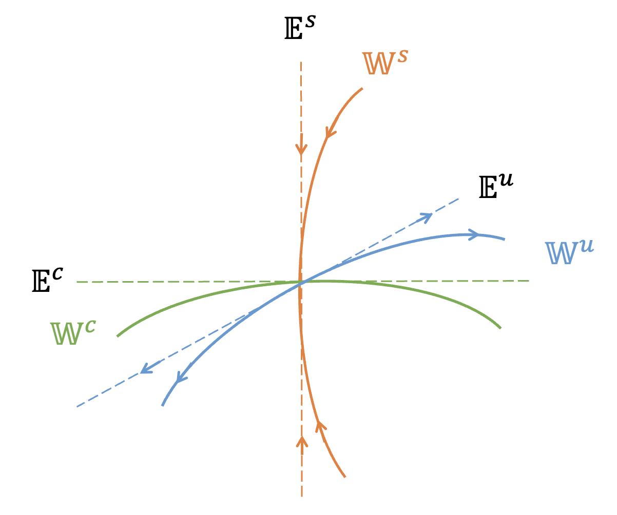 먼저 평형점 근방에서 안정(stable), 불안정(unstable) 및 센터(center) 매니폴드 \( ( \mathbb{W}^s (\mathbf{x}_e), \mathbb{W}^u (\mathbf{x}_e), \mathbb{W}^c (\mathbf{x}_e)) \) 가 존재하고 이러한 매니폴드는 평형점 \(\mathbf{x}_e\) 또는 \(\mathbf{y}=0\) 에서 각각의 부분공간인 \((\mathbb{E}^s, \mathbb{E}^u, \mathbb{E}^c)\) 에 접(tangent)한다. 그리고 안정한 매니폴드 \(\mathbb{W}^s\) 에 있는 궤적은 \(t \to +\infty\) 일 때 지수적으로 평형점에 수렴하고, 불안정한 매니폴드 \(\mathbb{W}^u\) 에 있는 궤적은 \( t \to -\infty\) 일 때 지수적으로 평형점에 수렴한다. 센터 매니폴드 \(\mathbb{W}^c\) 상의 궤적은 비선형 항에 따라서 평형점으로 수렴하거나 발산한다.