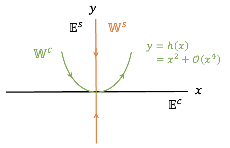 여기서 \(A_s \in \mathbb{R}^{s \times s}\) 는 실수부가 음수인 고유값을 갖는 행렬, \(A_u \in \mathbb{R}^{u \times u}\) 는 실수부가 양수인 고유값을 갖는 행렬, \(A_c \in \mathbb{R}^{c \times c}\) 는 실수부가 \(0\) 인 고유값을 갖는 행렬이다. \(\mathbf{g}_c\), \(\mathbf{g}_s\), \(\mathbf{g}_u\) 는 각각 벡터 \(T\mathcal{O}(|\mathbf{y}|^2 )\) 의 \(c, s, u\) 개의 성분들로 구성된 벡터이다.